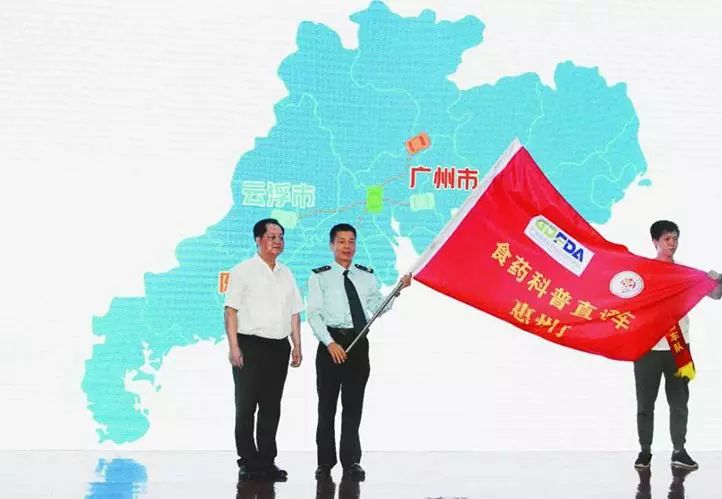 图为广东省食安办主任、省食品药品监管局局长骆文智(左一)向惠州市食药监局食药科普直通车授旗。