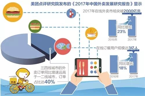 近年来,互联网对餐饮业持续渗透、赋能,推动外卖行业高速增长。美团点评研究院发布的《2017年中国外卖发展研究报告》显示,2017年在线外卖市场突破2000亿元,同比增长23%;在线订餐用户规模达3亿人,同比增长18%。